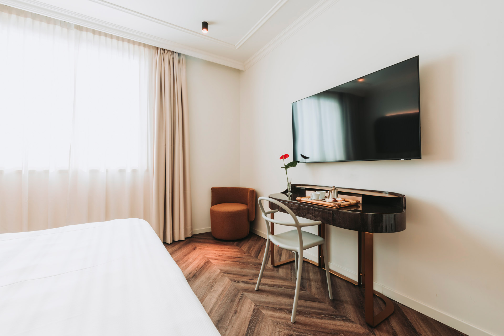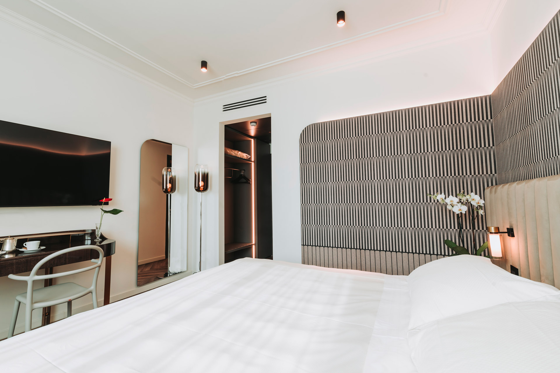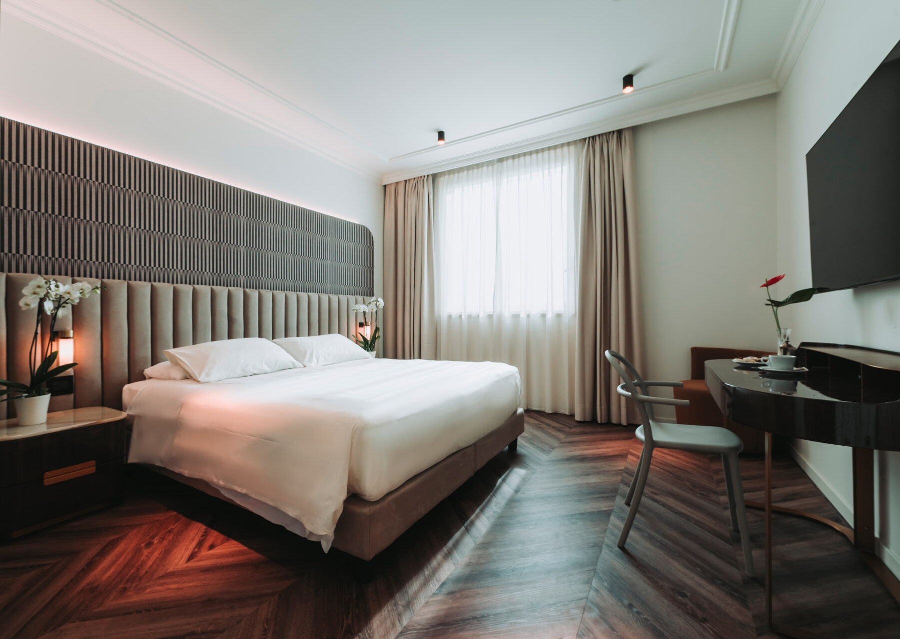 Prenota ora La nuova camera Executive, completamente rinnovata, ha una superficie di 23mq, letto matrimoniale o due letti singoli, una comoda poltroncina, un desk moderno con sedia, grande TV a muro con programmi Sat e Sky, Pay Per View, connessione Wi-Fi, telefono, Mini-Bar e Cassaforte.