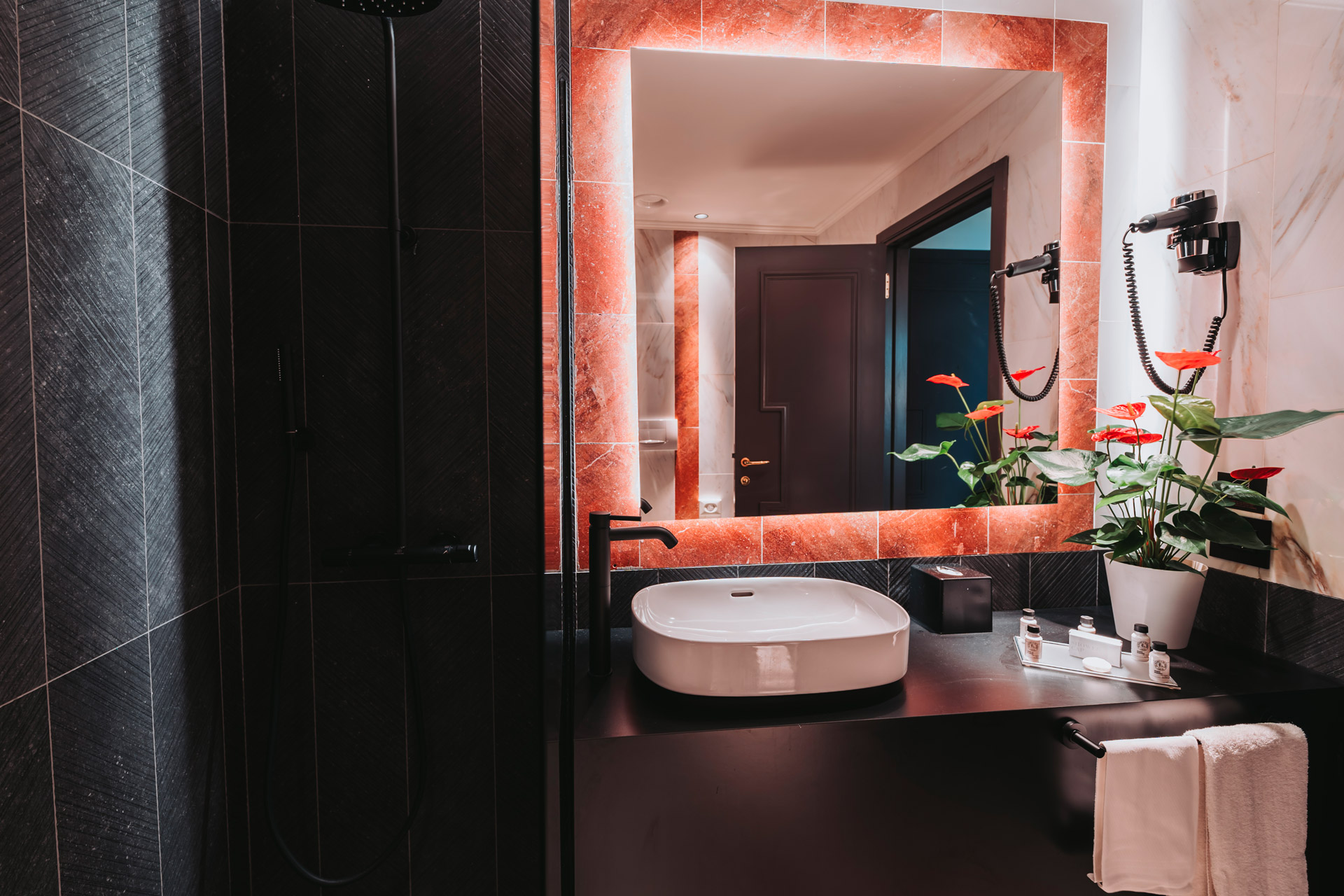 Bagno in marmo con ampia doccia, asciugacapelli e kit cortesia.